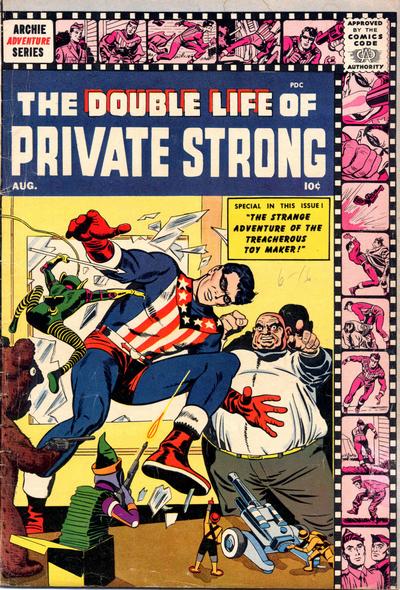 In June 1959, Jack Kirby and Joe Simon published a title for the new "Archie Adventure Series", The Double Life of Private Strong, introducing the patriotic character, The Shield. Not related to the prior characters who shared the same name and similar costume in other books, the Shield's real identity was that of Lancelot Strong. Strong's scientist father developed a method to create a superhuman being by expanding the mind, which he experimented on his infant son. Once his father was killed by foreign agents trying to discover the secret, Lancelot was adopted by a farm couple and raised as their own son. As the youth entered his teens, Lancelot soon discovered the truth about his background and his many super powers. Strong had incredible strength, the power of flight, near-invulnerability, super vision, an ability to generate lightning, and other wonders. Discovering a flag inspired costume left for him by his deceased father, he became the masked superhero, The Shield. Joining the Army, Lancelot acted like a foolish country bumpkin, while leading a double life as the superhero Shield on the side (hence the title of his comic). DC Comics soon notified Archie Comics of their concerns, claiming that The Shield was too similar to Superman, so after two short issues, his comic was cancelled to prevent a lawsuit, with Simon and Kirby moving on to their next project.
