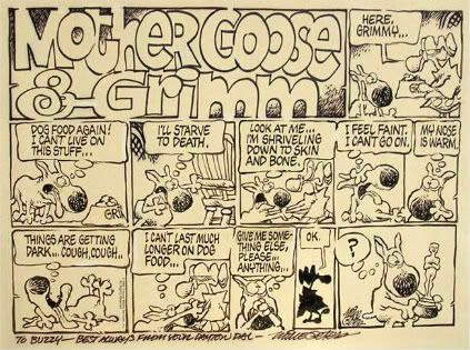 Here is one of the shortest of bios for any of the National Cartoonist Society award winning cartoonists...Mike Peters was born October 9, 1943 to Bill and Charlotte Peters. He went through thirteen years of Catholic Education unscathed. While attending classes at Washington University in St. Louis, he met his best friend and later to be his wife, Marian. They moved to Chicago where the artist worked with the Daily News art staff for one short year. Mike soon got drafted and spent two years in Okinawa. After being discharged from the army Mike became the new editorial cartoonist for the Dayton Daily News. He later started his popular syndicated feature, Mother Goose and Grimm, in 1984. He and Marian have three daughters and more awards than he think he deserves.
